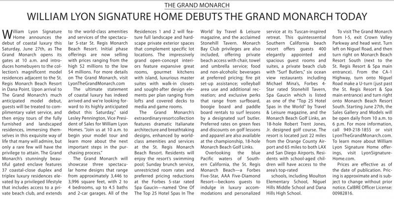 to the world-class amenities and services of the spectacular 5-star St. Regis Monarch Beach Resort. initial phase offerings are now selling with prices ranging from the high $2 millions to the low $4 millions. For more details on The Grand Monarch, visit LyonTheGrandMonarch.com The ultimate statement of coastal luxury has indeed arrived and we’re looking forward to its highly anticipated debut this Saturday,” said Lesley Pennington, Vice President of Sales for William Lyon Homes. “Join us at 10 a.m. to begin your model tour and learn more about the next important steps in the purchasing process.”