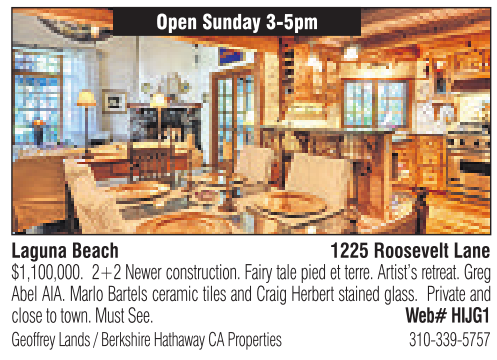 Laguna Beach Open Sunday 3-5pm 1225 Roosevelt Lane $1,100,000. 2+2 Newer construction.Fairy tale pied et terre. Artist’s retreat. Greg Abel AIA. Marlo Bartels ceramic tiles and Craig Herbertstained glass. Privateand close to town. Must See. Web# HIJG1 Geoffrey Lands /BerkshireHathaway CA Properties 310-339-5757