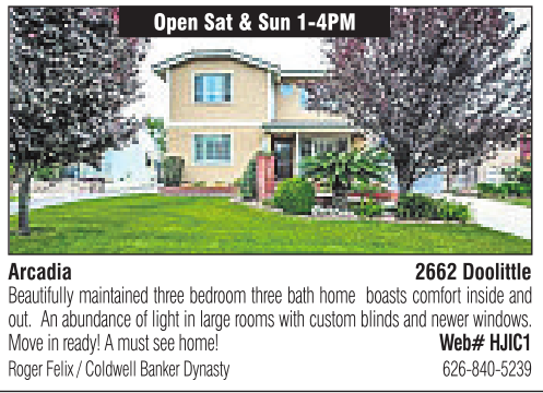 Arcadia Open Sat &Sun 1-4PM 2662 Doolittle Roger Felix /Coldwell Banker Dynasty 626-840-5239 Beautifully maintained three bedroom three bath home boasts comfortinside and out. Anabundance of lightinlarge rooms with custom blinds andnewer windows. Move in ready! Amustsee home! Web# HJIC1