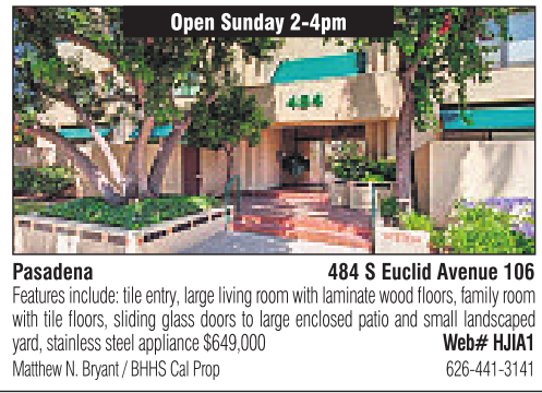 Open Sunday 2-4pm Pasadena 484 SEuclid Avenue 106 Matthew N. Bryant /BHHS Cal Prop 626-441-3141 Features include: tile entry,large living room with laminate woodfloors, family room with tile floors, sliding glass doors tolarge enclosed patio and small landscaped yard,stainlesssteel appliance $649,000 Web# HJIA1