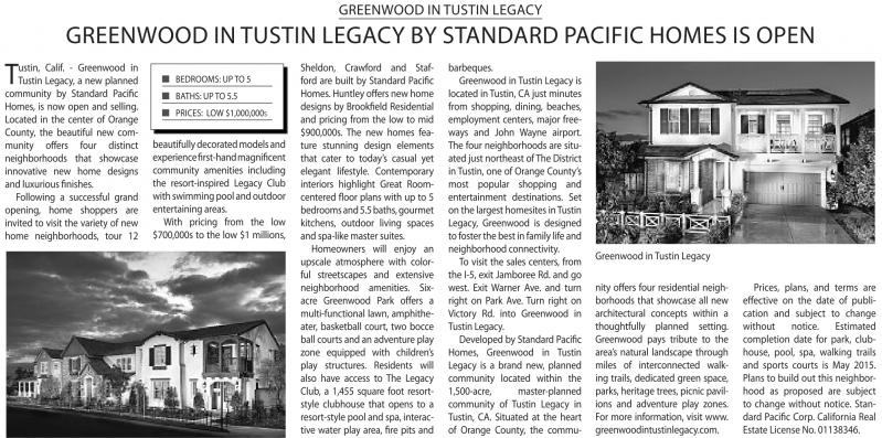 Calif. - Greenwood in Tustin Legacy, a new planned community by standard Pacific Homes, is now open and selling. Located in the center of Orange County, the beautiful new community offers four distinct neighborhoods that showcase innovative new home designs and luxurious finishes.