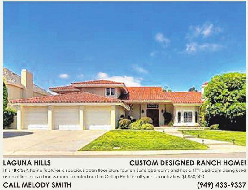 LAGUNA HILLS CUSTOM DESIGNED RANCH HOME! This 4BR/5BA home features aspacious open floor plan, four en-suite bedrooms and has afifth bedroom being used as an office, plus abonus room. Located next to Gallup Park for all your fun activities. $1,850,000 CALL MELODY SMITH (949) 433-9337