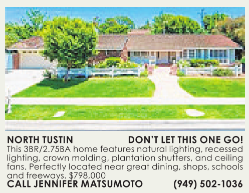 NORTH TUSTIN DON’T LET THIS ONE GO! This 3BR/2.75BA home features natural lighting, recessed lighting, crown molding, plantation shutters, and ceiling fans. Perfectly located near great dining, shops, schools and freeways. $798,000 CALL JENNIFER MATSUMOTO (949) 502-1036