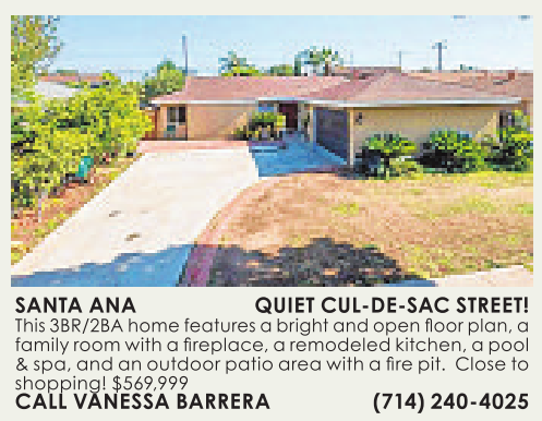 SANTA ANA QUIET CUL-DE-SAC STREET! This3BR/2BA homefeaturesabrightand open floor plan,a family room with afireplace,aremodeled kitchen, apool &spa, and an outdoor patio area with afire pit. Close to shopping! $569,999 CALL VANESSA BARRERA (714) 240-4025