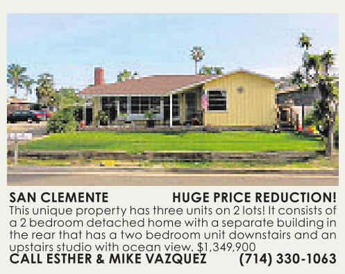 SAN CLEMENTE HUGE PRICE REDUCTION! This unique property has threeunits on 2lots! It consists of a2bedroom detached homewith aseparate buildingin the rear that has atwo bedroom unit downstairs and an upstairs studio with ocean view. $1,349,900 CALL ESTHER &MIKE VAZQUEZ (714) 330-1063