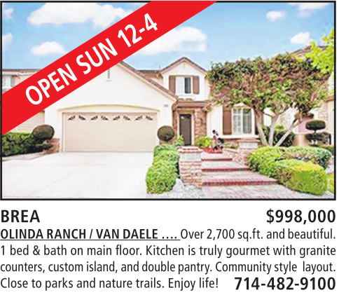 BREA $998,000 OLINDA RANCH/VAN DAELE …. Over 2,700sq.ft.and beautiful. 1bed &bath onmain floor. Kitchen is truly gourmet with granite counters, customisland,and double pantry.Communitystyle layout. Close to parksand naturetrails. Enjoy life! 714-482-9100