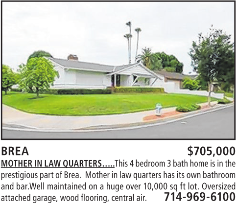 BREA $705,000 MOTHER IN LAWQUARTERS…..This 4bedroom3bath home is in the prestigious part of Brea. Motherinlaw quartershas itsown bathroom and bar.Well maintained on ahuge over 10,000 sq ft lot. Oversized attachedgarage, wood flooring, centralair. 714-969-6100