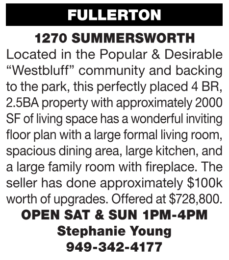 FULLERTON 1270 SUMMERSWORTH Located in the Popular & Desirable “Westbluff” community and backing to the park, this perfectly placed 4 BR, 2.5BAproperty with approximately2000 SF of living spacehas awonderfulinviting floor plan with alarge formal living room, spacious dining area, large kitchen, and a large family room with fireplace. The seller has done approximately $100k worth of upgrades. Offered at $728,800. OPEN SAT & SUN 1PM-4PM Stephanie Young 949-342-4177