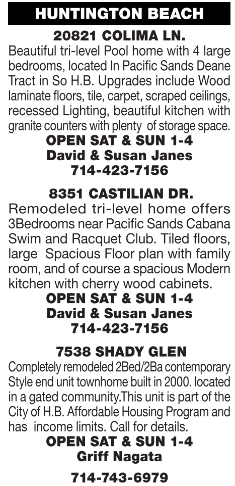 HUNTINGTON BEACH 20821 COLIMA LN. Beautiful tri-level Pool home with 4 large bedrooms, locatedInPacific SandsDeane Tract in So H.B. Upgrades include Wood laminate floors, tile, carpet,scrapedceilings, recessed Lighting, beautiful kitchen with granite counterswithplenty ofstorage space. OPEN SAT & SUN 1-4 David & Susan Janes 714-423-7156 8351 CASTILIAN DR. Remodeled tri-level home offers 3Bedrooms near Pacific Sands Cabana Swim and Racquet Club. Tiled floors, large Spacious Floor plan with family room, and of course a spacious Modern kitchen with cherry wood cabinets. OPEN SAT & SUN 1-4 David & Susan Janes 714-423-7156 7538 SHADY GLEN Completely remodeled2Bed/2Bacontemporary Styleend unit townhome builtin2000.located in agated community.This unit is part of the City of H.B.AffordableHousing Programand has income limits. Call for details. OPEN SAT & SUN 1-4 Griff Nagata 714-743-6979
