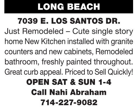 LONG BEACH 7039 E. LOS SANTOS DR. Just Remodeled – Cute single story home New Kitchen installed with granite counters and new cabinets, Remodeled bathroom, freshly painted throughout. Greatcurbappeal.PricedtoSellQuickly! OPEN SAT & SUN 1-4 Call Nahi Abraham 714-227-9082