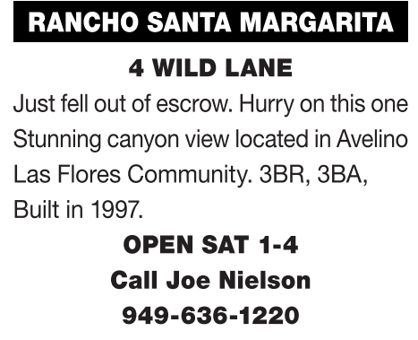 RANCHO SANTA MARGARITA 4 WILD LANE Just fell out of escrow. Hurry on this one Stunning canyon view located in Avelino Las Flores Community. 3BR, 3BA, Built in 1997.