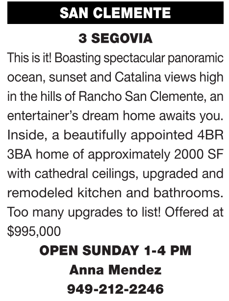 SAN CLEMENTE 3 SEGOVIA This is it!Boastingspectacularpanoramic ocean, sunset and Catalina views high in the hills of Rancho San Clemente, an entertainer’s dream home awaits you. Inside, a beautifully appointed 4BR 3BA home of approximately 2000 SF with cathedral ceilings, upgraded and remodeled kitchen and bathrooms. Too many upgrades to list! Offered at $995,000 OPEN SUNDAY 1-4 PM Anna Mendez 949-212-2246