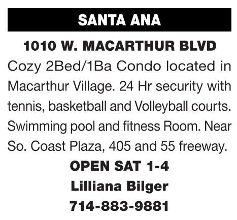 SANTA ANA 1010 W. MACARTHUR BLVD Cozy 2Bed/1Ba Condo located in Macarthur Village. 24 Hr security with tennis, basketball and Volleyball courts. Swimming pool and fitness Room. Near So. Coast Plaza, 405 and 55 freeway. OPEN SAT 1-4 Lilliana Bilger 714-883-9881