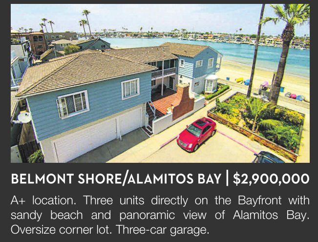 A+ location. Three units directly on the Bayfront with sandy beach and panoramic view of Alamitos Bay. Oversize corner lot. Three-car garage.
