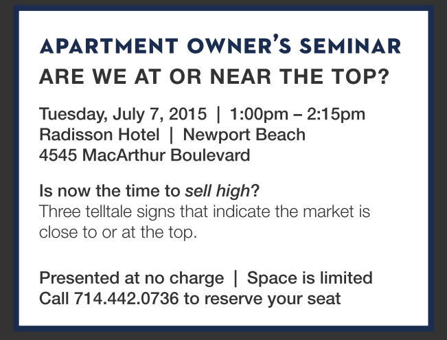 APARTMENT OWNER’S SEMINAR ARE WE AT OR NEAR THE TOP? Tuesday, July 7, 2015 | 1:00pm – 2:15pm Radisson Hotel | Newport Beach 4545 MacArthur Boulevard Is now the time to sell high? Three telltale signs that indicate the market is close to or at the top. Presented at no charge | Space is limited Call 714.442.0736 to reserve your seat