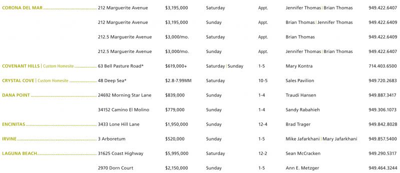 LAGUNA BEACH................................................ 31625 Coast Highway $5,995,000 Saturday 12-2 Sean McCracken 949.290.5317