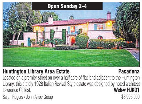 Open Sunday 2-4 Huntington LibraryArea Estate Pasadena Sarah Rogers /JohnArroe Group $3,995,000 Located on apremier street on overahalf acreofflat land adjacent to the Huntington Library,thisstately1928 Italian Revival Style estate wasdesigned by notedarchitect Lawrence C. Test. Web# HJKQ1