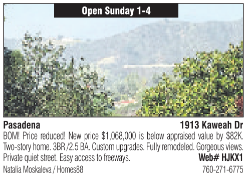 Pasadena Open Sunday 1-4 1913 Kaweah Dr Natalia Moskaleva /Homes88 760-271-6775 BOM! Price reduced! New price $1,068,000 is below appraised value by $82K. Two-story home. 3BR /2.5BA. Custom upgrades. Fully remodeled. Gorgeous views. Private quiet street.Easyaccess to freeways. Web# HJKX1
