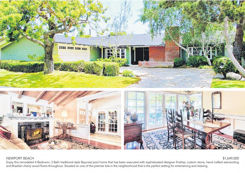 NEWPORT BEACH $1,649,000 Enjoy this remodeled 4 Bedroom, 3 Bath traditional style Baycrest pool home that has been executed with sophisticated designer finishes, custom stone, hand crafted wainscoting and Brazilian cherry wood floors throughout. Situated on one of the premier lots in the neighborhood that is the perfect setting for entertaining and relaxing.