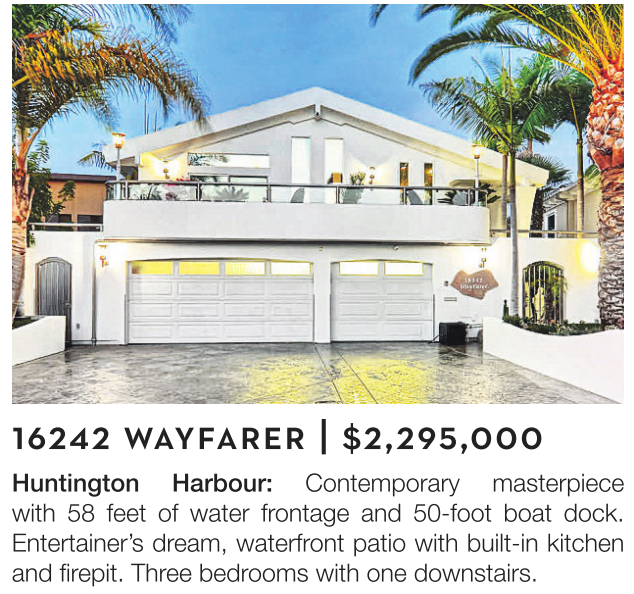 Huntington Harbour: Contemporary masterpiece with 58 feet of water frontage and 50-foot boat dock. Entertainer’s dream, waterfront patio with built-in kitchen and firepit. Three bedrooms with one downstairs.
