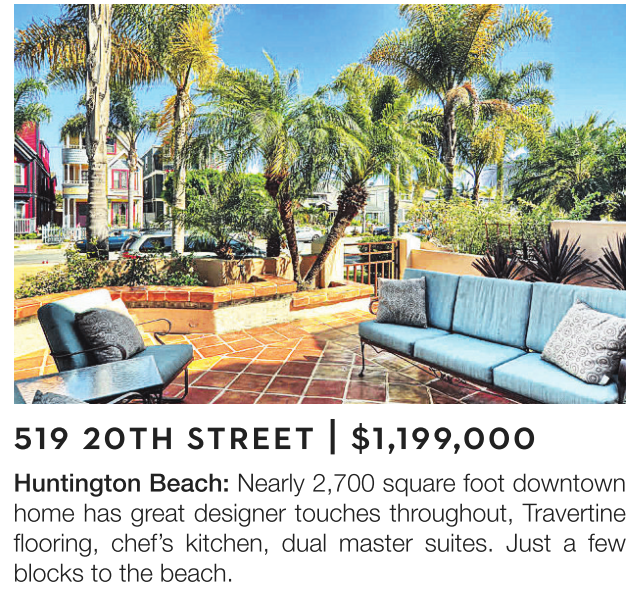 Huntington Beach: Nearly 2,700 square foot downtown home has great designer touches throughout, Travertine flooring, chef’s kitchen, dual master suites. Just a few blocks to the beach.