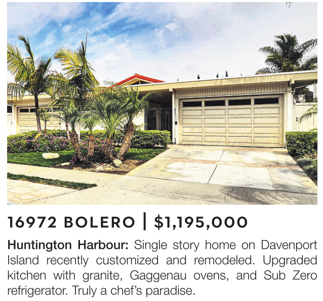 Huntington Harbour: Single story home on Davenport Island recently customized and remodeled. Upgraded kitchen with granite, Gaggenau ovens, and Sub Zero refrigerator. Truly a chef’s paradise.
