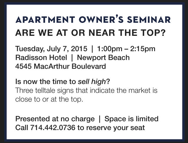 APARTMENT OWNER’S SEMINAR ARE WE AT OR NEAR THE TOP? Tuesday, July 7, 2015 | 1:00pm – 2:15pm Radisson Hotel | Newport Beach 4545 MacArthur Boulevard Is now the time to sell high? Three telltale signs that indicate the market is close to or at the top. Presented at no charge | Space is limited Call 714.442.0736 to reserve your seat