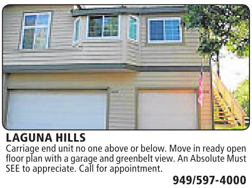 LAGUNA HILLS Carriage endunitnooneabove or below. Move in readyopen floor plan with agarageand greenbeltview. An Absolute Must SEEtoappreciate. Call for appointment.