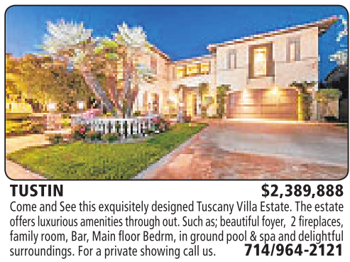 TUSTIN $2,389,888 Come andSee this exquisitelydesignedTuscany VillaEstate.The estate offersluxurious amenitiesthrough out. Such as;beautifulfoyer, 2fireplaces, family room, Bar,Main floorBedrm, in groundpool&spa anddelightful surroundings.For aprivateshowing call us. 714/964-2121