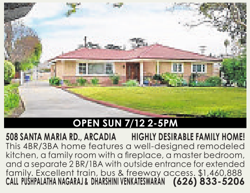 OPEN SUN 7/12 2-5PM 508 SANTA MARIA RD., ARCADIA HIGHLY DESIRABLE FAMILY HOME! This 4BR/3BA home features awell-designed remodeled kitchen, afamilyroomwith afireplace, amasterbedroom, andaseparate 2BR/1BAwith outsideentrancefor extended family. Excellent train, bus &freeway access. $1,460,888 CALL PUSHPALATHA NAGARAJ & DHARSHINI VENKATESWARAN (626) 833-5206