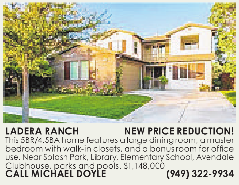 LADERA RANCH NEW PRICE REDUCTION! This 5BR/4.5BAhome features alarge diningroom, amaster bedroom with walk-inclosets,and abonusroomfor office use.NearSplash Park,Library,ElementarySchool, Avendale Clubhouse, parks and pools. $1,148,000 CALL MICHAEL DOYLE (949) 322-9934