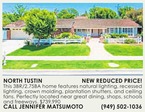 NORTH TUSTIN NEW REDUCED PRICE! This 3BR/2.75BA home features natural lighting, recessed lighting, crown molding, plantation shutters, and ceiling fans. Perfectly located near great dining, shops, schools and freeways. $739,990 CALL JENNIFER MATSUMOTO (949) 502-1036