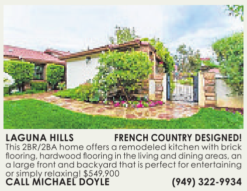 LAGUNA HILLS FRENCH COUNTRY DESIGNED! This 2BR/2BA home offers aremodeled kitchen with brick flooring, hardwood flooringinthe living and diningareas,an alarge frontand backyardthatisperfect forentertaining or simply relaxing! $549,900 CALL MICHAEL DOYLE (949) 322-9934 See also