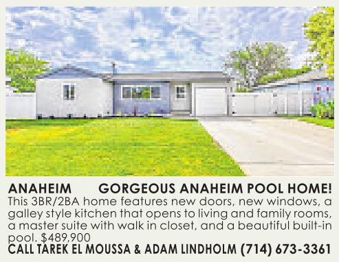 ANAHEIM GORGEOUS ANAHEIM POOL HOME! This 3BR/2BA home features new doors, new windows, agalley stylekitchen that openstoliving andfamilyrooms, amaster suite with walk in closet, and abeautiful built-in pool. $489,900 CALL TAREK ELMOUSSA &ADAM LINDHOLM (714)673-3361