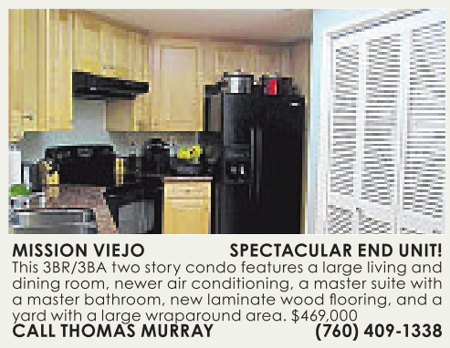 MISSION VIEJO SPECTACULAR END UNIT! This 3BR/3BA two story condo features alarge living and dining room, newer air conditioning, amaster suite with amaster bathroom, new laminate wood flooring, and ayard with alarge wraparound area. $469,000 CALL THOMAS MURRAY (760) 409-1338
