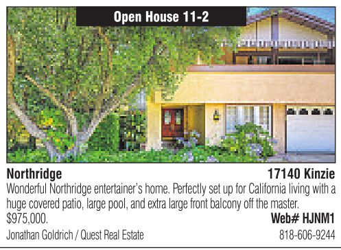 Northridge Open House 11-2 17140 Kinzie WonderfulNorthridgeentertainer’s home. Perfectly set up for California living with ahuge covered patio, large pool, and extra largefront balcony offthe master. $975,000. Web# HJNM1 Jonathan Goldrich/Quest Real Estate 818-606-9244