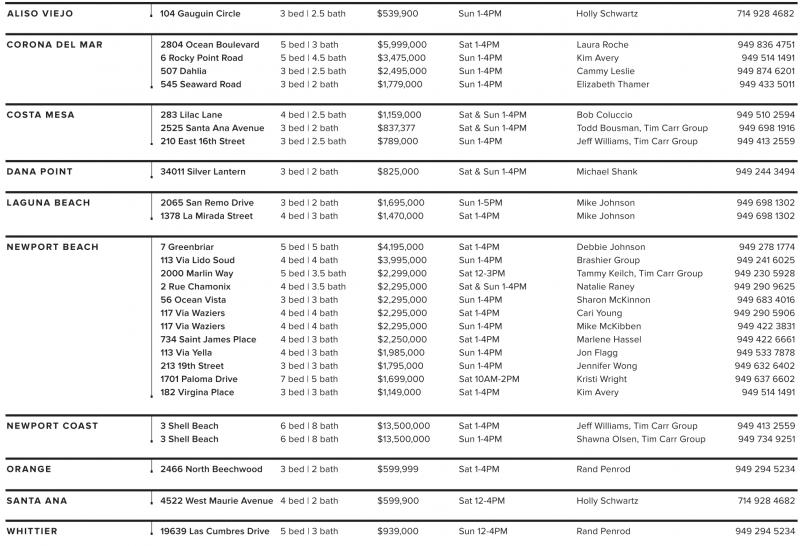 CORONA DEL MAR 2804 Ocean Boulevard 5 bed | 3 bath $5,999,000 Sat 1-4PM Laura Roche 949 836 4751 6 Rocky Point Road 5 bed | 4.5 bath $3,475,000 Sun 1-4PM Kim Avery 949 514 1491 507 Dahlia 3 bed | 2.5 bath $2,495,000 Sun 1-4PM Cammy Leslie 949 874 6201 545 Seaward Road 3 bed | 2 bath $1,779,000 Sun 1-4PM Elizabeth Thamer 949 433 5011