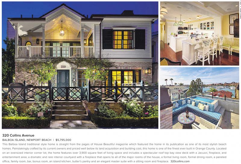 BALBOA ISLAND, NEWPORT BEACH | $5,795,000 This Balboa Island traditional style home is straight from the pages of House Beautiful magazine which featured the home in its publication as one of its most stylish beach homes. Painstakingly crafted by its current owners and priced well below its land acquisition and building cost, this home is one of the finest ever built in Orange County. Located on an oversized interior corner lot, the home features over 3,900 square feet of living space and includes a spectacular roof top bay view deck with a Jacuzzi, fireplace, and entertainment area; a dramatic and rare interior courtyard with a fireplace that opens to all of the major rooms of the house, a formal living room, formal dining room, a paneled office, family room, bar, bonus room, an island kitchen, butler’s pantry and an elegant master suite with a sitting room and fireplace. 320collins.com