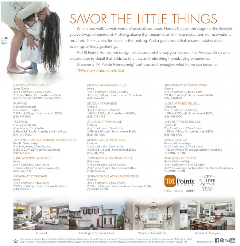 Plansand prices effectivedate of publicationand subject to change withoutnotice. Square footages areapproximate. Photos are of model homesand arefor illustrativepurposesonly. Modelsdonot reflect racialpreference.*Brokermustaccompanyand register buyeronbuyer’sfirst visittothe NewHomeGallery.Referralfee paid uponclose of escrow.TRI Pointe Communities, Inc. BRE 01888935.7/15