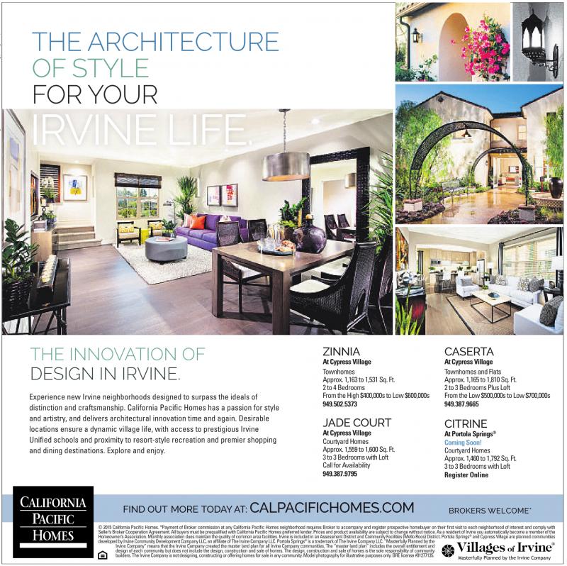 ©2015California Pacific Homes. *Payment of Broker commission at any California Pacific Homesneighborhood requires Broker to accompanyand registerprospectivehomebuyer on their first visit to each neighborhood of interest and comply with Seller’sBroker CooperationAgreement. All buyers must be prequalifiedwithCalifornia Pacific Homes preferred lender.Prices and product availability are subject to change without notice. As aresident of Irvine you automatically become amember of the Homeowner’sAssociation. Monthly association dues maintain the quality of common area facilities. Irvine is included in an Assessment District and Community Facilities (Mello Roos) District.Portola Springs ® andCypress Villageare planned communities developed by Irvine Community Development Company LLC, anaffiliate of The Irvine Company LLC. Portola Springs ® is atrademark of The Irvine Company LLC. “Masterfully Planned by the Irvine Company” meansthat the Irvine Company created the master landplan for all IrvineCompany communities.The “masterland plan” includes the overallentitlement and design of each community but does not includethe design, construction and sale of homes. The design,construction and sale of homes is the sole responsibility of community builders. The Irvine Company is not designing, constructing or offering homes for sale in any community.Model photography forillustrative purposes only.BRE license#01277135.