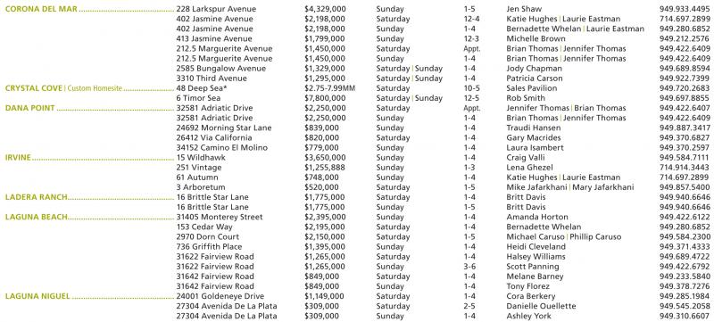 CORONA DEL MAR........................................... 228 Larkspur Avenue $4,329,000 Sunday 1-5 Jen Shaw 949.933.4495 402 Jasmine Avenue $2,198,000 Saturday 12-4 Katie Hughes | Laurie Eastman 714.697.2899 402 Jasmine Avenue $2,198,000 Sunday 1-4 Bernadette Whelan | Laurie Eastman 949.280.6852 413 Jasmine Avenue $1,799,000 Sunday 12-3 Michelle Brown 949.212.2576 212.5 Marguerite Avenue $1,450,000 Saturday Appt. Brian Thomas | Jennifer Thomas 949.422.6409 212.5 Marguerite Avenue $1,450,000 Sunday 1-4 Brian Thomas | Jennifer Thomas 949.422.6409 2585 Bungalow Avenue $1,329,000 Saturday | Sunday 1-4 Jody Chapman 949.689.8594 3310 Third Avenue $1,295,000 Saturday | Sunday 1-4 Patricia Carson 949.922.7399 CRYSTAL COVE | Custom Homesite....................... 48 Deep Sea* $2.75-7.99MM Saturday 10-5 Sales Pavilion 949.720.2683 6 Timor Sea $7,800,000 Saturday | Sunday 12-5 Rob Smith 949.697.8855 DANA POINT..................................................... 32581 Adriatic Drive $2,250,000 Saturday Appt. Jennifer Thomas | Brian Thomas 949.422.6407 32581 Adriatic Drive $2,250,000 Sunday 1-4 Brian Thomas | Jennifer Thomas 949.422.6409 24692 Morning Star Lane $839,000 Sunday 1-4 Traudi Hansen 949.887.3417 26412 Via California $820,000 Saturday 1-4 Gary Macrides 949.370.6827 34152 Camino El Molino $779,000 Sunday 1-4 Laura Isambert 949.370.2597 IRVINE................................................................ 15 Wildhawk $3,650,000 Sunday 1-4 Craig Valli 949.584.7111 251 Vintage $1,255,888 Sunday 1-3 Lena Ghezel 714.914.3443 61 Autumn $748,000 Sunday 1-4 Katie Hughes | Laurie Eastman 714.697.2899 3 Arboretum $520,000 Saturday 1-5 Mike Jafarkhani | Mary Jafarkhani 949.857.5400 LADERA RANCH................................................ 16 Brittle Star Lane $1,775,000 Saturday 1-4 Britt Davis 949.940.6646 16 Brittle Star Lane $1,775,000 Sunday 1-5 Britt Davis 949.940.6646 LAGUNA BEACH................................................ 31405 Monterey Street $2,395,000 Sunday 1-4 Amanda Horton 949.422.6122 153 Cedar Way $2,195,000 Saturday 1-4 Bernadette Whelan 949.280.6852 2970 Dorn Court $2,150,000 Saturday 1-5 Michael Caruso | Phillip Caruso 949.584.2300 736 Griffith Place $1,395,000 Sunday 1-4 Heidi Cleveland 949.371.4333 31622 Fairview Road $1,265,000 Saturday 1-4 Halsey Williams 949.689.4722 31622 Fairview Road $1,265,000 Sunday 3-6 Scott Panning 949.422.6792 31642 Fairview Road $849,000 Saturday 1-4 Melane Barney 949.233.5840 31642 Fairview Road $849,000 Sunday 1-4 Tony Florez 949.378.7276 LAGUNA NIGUEL.............................................. 24001 Goldeneye Drive $1,149,000 Saturday 1-4 Cora Berkery 949.285.1984 27304 Avenida De La Plata $309,000 Saturday 2-5 Danielle Ouellette 949.545.2058 27304 Avenida De La Plata $309,000 Sunday 1-4 Ashley York 949.310.6607