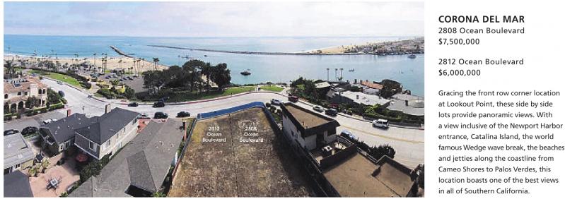 CORONA DEL MAR 2808 Ocean Boulevard $7,500,000 2812 Ocean Boulevard $6,000,000 Gracing the front row corner location at Lookout Point, these side by side lots provide panoramic views. With a view inclusive of the Newport Harbor entrance, Catalina Island, the world famous Wedgewave break, thebeaches and jetties along the coastline from Cameo Shores to Palos Verdes, this location boasts one of the best views in all of Southern California. See also