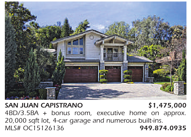 SAN JUAN CAPISTRANO $1,475,000 4BD/3.5BA + bonus room, executive home on approx. 20,000 sqft lot, 4-car garage and numerous built-ins. MLS# OC15126136 949.874.0935