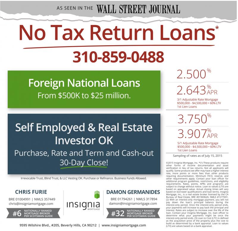 ©2015 Insignia Mortgage, Inc. *(1) These products require other forms of income documentation and asset verification in lieu of tax returns. Not all applicants will qualify. Some products we offer may have ahigher interest rate, more points or more fees than other products requiring documentation. Minimum FICO, reserve, and other requirements apply. Contact your loan officer for additional program guidelines, restrictions, and eligibility requirements. Rates, points, APRs and programs are subject to change without notice. Loan to values (LTV) are based on appraised value. Actual closing times will vary based on borrower qualifications and loan terms. Insignia Mortgage, Inc., is a real estate broker licensed by the CA Bureau of Real Estate, BRE #01969620, NMLS #1277691. (2) With an interest-only mortgage payment, you will not pay down the loan's principal balance during the interest-only period. Once the interest-only period ends, your payments will increase to pay back the principal and interest. Rates are subject to increase over the life of the loan. Contact your Insignia Mortgage, Inc. loan officer to determine what your payments might be once the interest-only period ends. (3) Loan to Cost (LTC) is defined as the acquisition price of the property plus the cost to build as determined by a bank appraisal. Loan to values (LTV) are values based on abank appraisal.