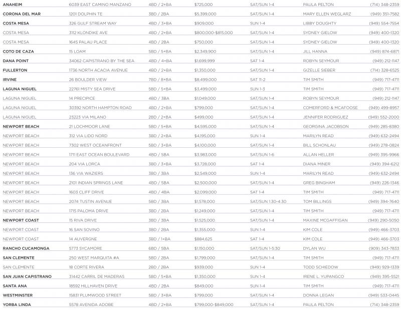 DANA POINT 34062 CAPISTRANO BY THE SEA 4BD / 4+BA $1,699,999 SAT 1-4 ROBYN SEYMOUR (949) 212-1147 FULLERTON 1736 NORTH ACACIA AVENUE 4BD / 2+BA $1,350,000 SAT/SUN 1-4 GIZELLE SIEBER (714) 328-6525 IRVINE 26 BOULDER VIEW 7BD / 8+BA $8,499,000 SAT 11-2 TIM SMITH (949) 717-4711 LAGUNA NIGUEL 22761 MISTY SEA DRIVE 5BD / 5+BA $3,499,000 SUN 1-3 TIM SMITH (949) 717-4711 LAGUNA NIGUEL 14 PRECIPICE 4BD / 3BA $1,049,000 SAT/SUN 1-4 ROBYN SEYMOUR (949) 212-1147 LAGUNA NIGUEL 30392 NORTH HAMPTON ROAD 4BD / 2+BA $799,000 SAT/SUN 1-4 COMERFORD & MCAFOOSE (949) 499-8957 LAGUNA NIGUEL 23223 VIA MILANO 2BD / 2+BA $499,000 SAT/SUN 1-4 JENNIFER RODRIGUEZ (949) 552-2000 NEWPORT BEACH 21 LOCHMOOR LANE 5BD / 5+BA $4,595,000 SAT/SUN 1-4 GEORGINA JACOBSON (949) 285-8380 NEWPORT BEACH 312 VIA LIDO NORD 3BD / 2+BA $4,195,000 SUN 1-4 MARILYN READ (949) 632-2494 NEWPORT BEACH 7302 WEST OCEANFRONT 5BD / 3+BA $4,100,000 SAT/SUN 1-4 BILL SCHONLAU (949) 278-0824 NEWPORT BEACH 1711 EAST OCEAN BOULEVARD 4BD / 5BA $3,983,000 SAT/SUN 1-6 ALLAN HELLER (949) 395-9966 NEWPORT BEACH 204 VIA LORCA 3BD / 3+BA $3,728,000 SAT 1-4 DIANA MINER (949) 394-6212 NEWPORT BEACH 136 VIA WAZIERS 3BD / 3BA $2,549,000 SUN 1-4 MARILYN READ (949) 632-2494 NEWPORT BEACH 2101 INDIAN SPRINGS LANE 4BD / 5BA $2,500,000 SAT/SUN 1-4 GREG BINGHAM (949) 226-1346 NEWPORT BEACH 1603 CLIFF DRIVE 4BD / 4BA $2,099,000 SAT 1-4 TIM SMITH (949) 717-4711 NEWPORT BEACH 2074 TUSTIN AVENUE 5BD / 3BA $1,578,000 SAT/SUN 1:30-4:30 TOM BILLINGS (949) 394-7640 NEWPORT BEACH 1715 PALOMA DRIVE 3BD / 2BA $1,249,000 SAT/SUN 1-4 TIM SMITH (949) 717-4711 NEWPORT COAST 15 RIVA DRIVE 3BD / 3BA $1,525,000 SAT/SUN 1-4 MAXINE MCGAFFIGAN (949) 290-5050 NEWPORT COAST 16 SAN SOVINO 3BD / 2BA $1,355,000 SUN 1-4 KIM COLE (949) 466-3703 NEWPORT COAST 14 AUVERGNE 3BD / 1+BA $884,625 SAT 1-4 KIM COLE (949) 466-3703 RANCHO CUCAMONGA 5773 SYCAMORE 6BD / 5BA $1,150,000 SAT/SUN 1-5:30 DYLAN WU (909) 343-7833 SAN CLEMENTE 250 WEST MARQUITA #A 5BD / 2BA $1,799,000 SAT/SUN 1-4 TIM SMITH (949) 717-4711 SAN CLEMENTE 18 CORTE RIVERA 2BD / 2BA $939,000 SUN 1-4 TODD SCHIEDOW (949) 929-1339 SAN JUAN CAPISTRANO 31442 CARRIL DE MADERAS 5BD / 5+BA $1,350,000 SUN 1-4 IRENE L. YUPANGCO (949) 395-5521 SANTA ANA 18592 HILLHAVEN DRIVE 4BD / 2BA $849,000 SUN 1-4 TIM SMITH (949) 717-4711 WESTMINSTER 15831 PLUMWOOD STREET 5BD / 3+BA $799,000 SAT/SUN 1-4 DONNA LEGAN (949) 533-0445 YORBA LINDA 5578 AVENIDA ADOBE 4BD / 2+BA $799,000-$849,000 SAT/SUN 1-4 PAULA PELTON (714) 348-2359