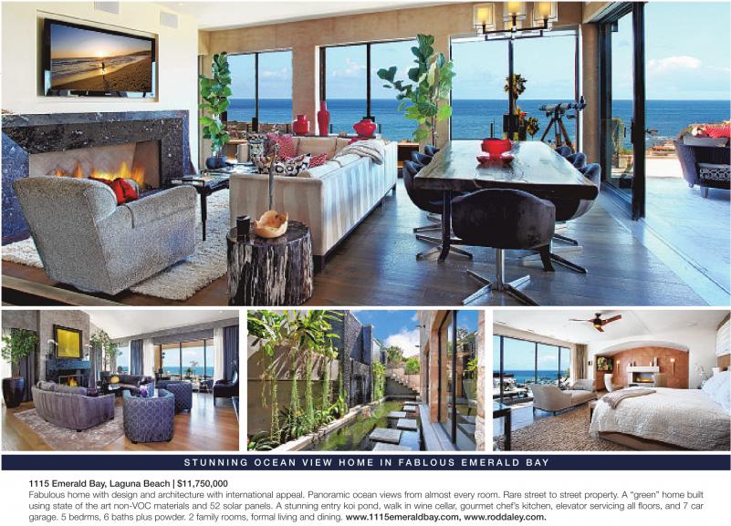 1115 Emerald Bay, Laguna Beach | $11,750,000 Fabulous home with design and architecture with international appeal. Panoramic ocean views from almost every room. Rare street to street property. A “green” home built using state of the art non-VOC materials and 52 solar panels. A stunning entry koi pond, walk in wine cellar, gourmet chef’s kitchen, elevator servicing all floors, and 7 car garage. 5 bedrms, 6 baths plus powder. 2 family rooms, formal living and dining. www.1115emeraldbay.com, www.roddaley.com.