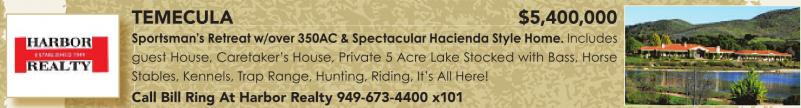 Sportsman’s Retreat w/over 350AC & Spectacular Hacienda Style Home. Includes guest House, Caretaker’s House, Private 5 Acre Lake Stocked with Bass, Horse Stables, Kennels, Trap Range, Hunting, Riding, It’s All Here! Call Bill Ring At Harbor Realty 949-673-4400 x101