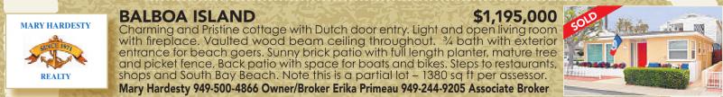 Charming and Pristine cottage with Dutch door entry. Light and open living room with fireplace. Vaulted wood beam ceiling throughout. ¾ bath with exterior entrance for beach goers. Sunny brick patio with full length planter, mature tree and picket fence. Back patio with space for boats and bikes. Steps to restaurants, s shops and South Bay Beach. Note this is a partial lot – 1380 sq ft per assessor. Mary Hardesty 949-500-4866 Owner/Broker Erika Primeau 949-244-9205 Associate Broker
