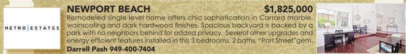 NEWPORT BEACH $1,825,000 Remodeled single level home offers chic sophistication in Carrara marble, wainscoting and dark hardwood finishes. Spacious backyard is backed by a park with no neighbors behind for added privacy. Several other upgrades and energy efficient features installed in this 3 bedrooms, 2 baths, “Port Street”gem. Darrell Pash 949-400-7404