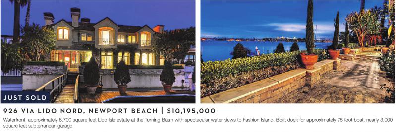 JUST SOLD 926 VIA LIDO NORD, NEWPORT BEACH | $10,195,000 Waterfront, approximately 6,700 square feet Lido Isle estate at the Turning Basin with spectacular water views to Fashion Island. Boat dock for approximately 75 foot boat, nearly 3,000 square feet subterranean garage. See also